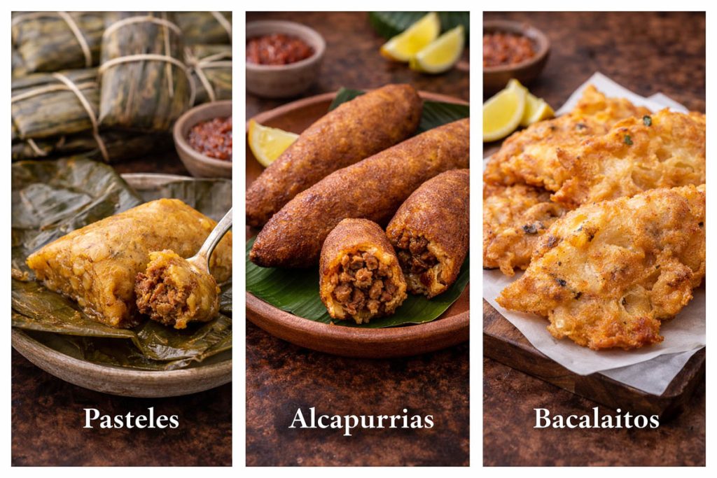 Traditional Puerto Rican Food - pasteles, alcapurrias fried plantain, and bacalaitos crispy codfish fritters